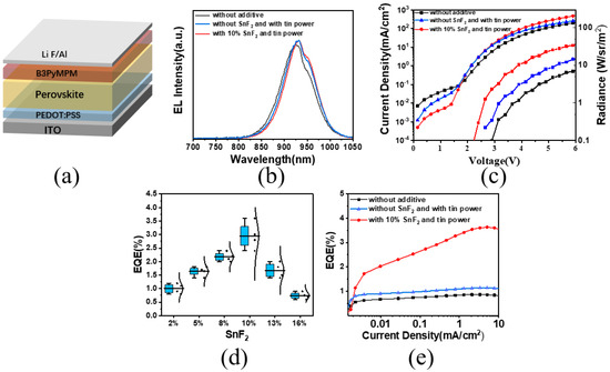 (a) LED device structure. (b) Electroluminescence spectra with different additives. (c) Current density and radiance of devices with different additives. (d) EQE values of devices with different concentrations of SnF2. (e) EQE values of devices with different additives.