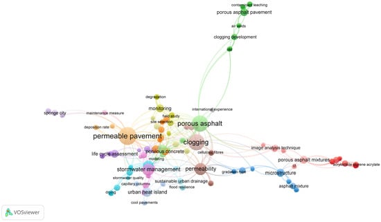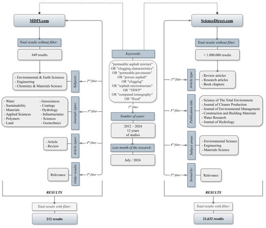 The data selection and collection processes were carried out in July 2024, and in the first step of the process the keywords used in the abovementioned databases were identified, such as “permeable asphalt mixture” OR “clogging characteristics” OR “permeable pavements” OR “porous asphalt” OR “clogging” OR “asphalt microstructure” OR “TRWP” OR “computed tomography” OR “flood”. In the second stage, the filters available in the databases were applied; for example, the periods of the research years, the types of papers, the types of publication and the subject areas, among others, as shown in Figure 1. The structural diagrams of the study developed in MDPI and ScienceDirect are presented. Figure 2 illustrates a diagram highlighting the connections between different keywords.