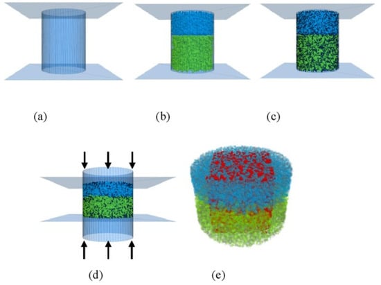 Virtual reconstruction of an double-layer asphalt mixture through the software DEM-CFD implemented in PFC 3D version 4.0: (a) creation of the virtual steel model; (b) introduction of coarse aggregates, represented by the colors blue and green; (c) addition of asphalt mastic, represented by the color black; (d) vertical compaction of the asphalt mixture; (e) representation of air voids, highlighted in red. [57].