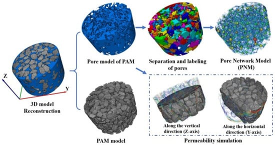 A 3D model pore structure analysis produced through the software Avizo: CT scanning and 3D model reconstruction to analyze the structural characteristics of porous asphalt mixture (PAM) and permeability simulation using the absolute permeability module [58].