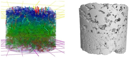 The VGStudio MAX software version 2023.4 allows the creation of Surface Tessellation Language (STL) files to represent surface sections and includes functions such as data filtering and application of a three-dimensional median filter [59]. In addition, it assists surface sectioning to determine volumetric data and performs detailed volumetric analyses, including porosity analysis and permeability simulations [60]. Below is an example of a simulation performed by the software VGStudio MAX, presented in Figure 6.