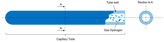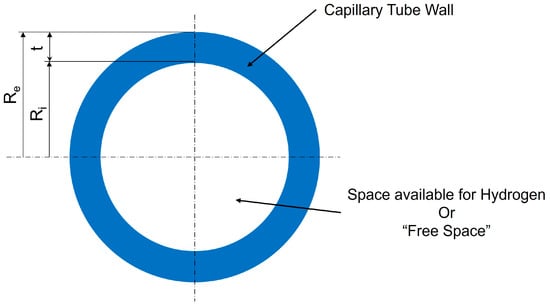 To understand how much hydrogen a capillary array system can store, it is important to introduce the concept of “free space” within a single capillary tube. This free space represents the portion of the tube’s interior available for hydrogen storage, excluding the solid material that forms the tube walls, as can be seen in Figure 5. In simpler terms, it measures how much of the tube is hollow and capable of holding gas, compared to the total tube size.
