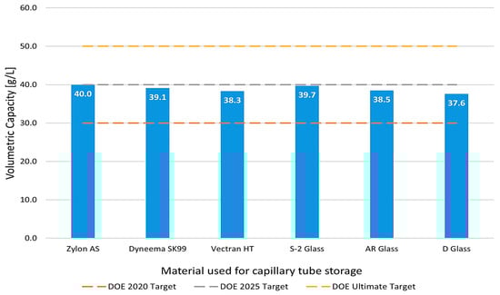 Among the materials studied, Zylon AS and S2 glass achieved the DOE’s 2025 target, reflecting their high potential for future applications. However, none of the materials reached the ultimate target outlined by the DOE. This gap suggests that further investigations, particularly the implementation of capillary arrays instead of single capillaries, could facilitate the achievement of the ultimate target. The structural design and optimization of capillary arrays may unlock enhanced volumetric capacities, paving the way for more efficient hydrogen storage solutions in next-generation energy systems.