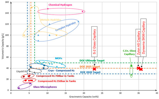 Storage capacity obtained for a single glass capillary composed of the analyzed materials compared to other existing storage technologies [17,28,29,30,31,32,33,34,35,36,37,38,39,40,41].