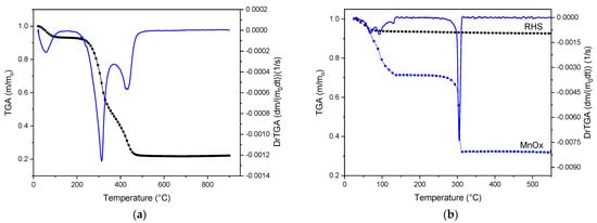Thermogravimetric analysis results obtained for (a) RH (TGA showed in black and DrTGA in blue) and (b) RHS and manganese acetate, which is the precursor of bulk MnOx.