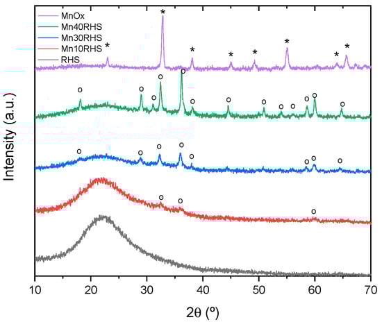 The synthesized catalysts (Mn10RHS, Mn30RHS, and Mn40RHS) exhibit a similar crystalline structure, and their broad reflections are related to the presence of amorphous SiO2, which indicates the structural stability of the support. For the supported catalysts, the diffraction pattern matches the crystalline structure of majority Mn3O4 (Hausmannite, tetragonal crystalline system, space group I41/amd) and minority β-MnO2 (Pyrolusite, tetragonal crystalline system, space group P42/mnm) [32]. The corresponding Bragg reflections display significant full widths at half maximum (FWHM), suggesting a possible confinement effect according to Scherrer’s equation [33]. Due to this broadening and the proximity of the Bragg reflections between Mn3O4 and β-MnO2, the samples are likely to contain both phases.
