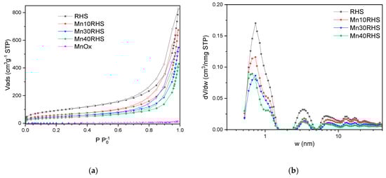 The N₂ physisorption isotherm presented in Figure 3a, along with the corresponding pore size distribution (PSD) in Figure 3b, illustrates the characteristics of all catalysts. According to the IUPAC classification [34], the isotherms are primarily Type II with H3 hysteresis loops. The PSD profiles for all catalysts and the RHS support are similar; however, the pores measuring approximately 1 nm decrease as the manganese phase content increases, resulting in a reduction in the microporosity of the samples.