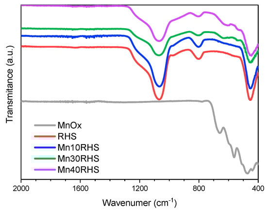The FT-IR analysis of the synthesized catalysts and RHS, as shown in Figure 4, reveals that RHS displays three main bands at 453 cm−1 and 1070 cm−1, corresponding to Si-O-Si bonds, and at 802 cm−1, related to silanol groups (Si-OH) on the surface. These silanol groups may interact with the carbonyl groups of acetone molecules, the VOC model used in this work, potentially impacting catalytic performance [21]. Bulk MnOx exhibits broad bands between 350 and 600 cm−1, with peak absorption around 480 cm−1 [32]. However, the specific phase of Mn2O3 (α or γ) cannot be determined from this analysis due to the similarity of FT-IR patterns reported in the literature [32]. Despite this limitation, the results align with the XRD findings. For the Mn40RHS and Mn30RHS catalysts, two characteristic peaks of Mn3O4 are identified at 475 cm−1 and 594 cm−1 [32]. In contrast, the FT-IR spectrum of Mn10RHS is similar to that of RHS.