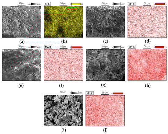 SEM micrographs and EDS mapping obtained for (a,b) RHS; (c,d) Mn10RHS; (e,f) Mn30RHS; (g,h) Mn40RHS; (i,j) MnOx. All figures were taken using a magnification of ×800.