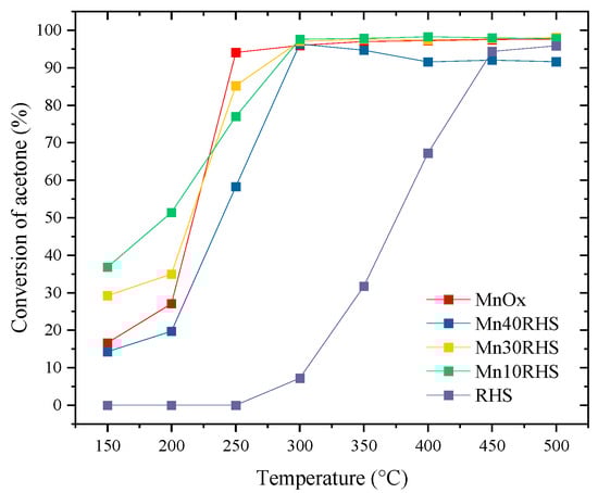 All catalysts demonstrated activity in acetone oxidation, with Mn30RHS and Mn40RHS showing notable conversion to CO2. Among the catalysts examined, Mn30RHS yielded the best overall performance. Notably, comparable catalytic behavior to bulk MnOx was achieved at 300 °C, allowing for a reduced quantity of transition metal oxide when supported on RHS.