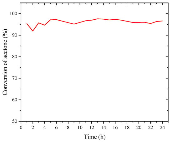 With Mn30RHS identified as the best supported catalyst for acetone, achieving conversions above 90%, its catalytic stability was evaluated over 24 h under the same flow conditions used for catalytic testing but at 300 °C, where an R value of 1 was achieved. The results are presented in Figure 8.