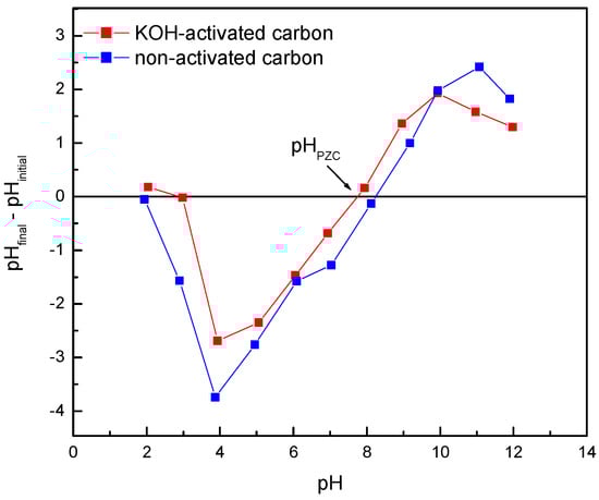 The value corresponding to the point of zero charge (pHpzc) can be determined by plotting ΔpH against the initial pH, as shown in Figure 1. The pHpzc shows the point at which the electrostatic interactions (positive and negative) are equal. In this way, below this value (pHpzc), the surface of the adsorbent is positively charged, while above it will be negatively charged. The values obtained for carbons without and with activation were 8.3 and 7.8, respectively. Therefore, considering that the dyes used in this study were cationic, it would be expected that adsorption would be enhanced at a pH higher than pHpzc. However, in this first stage, it was decided to work at a natural pH to simplify the operation and reduce costs.