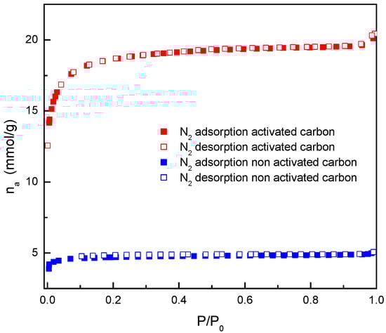 A deeper analysis of the nitrogen adsorption/desorption isotherms (Figure 4) confirmed that both have a shape similar to the Langmuir isotherm and can be designated type I isotherms. This type of isotherm was observed in materials whose porous structure is formed mainly by small pores, included within the so-called micropores. The main difference observed was the range of relative pressure in which the knee was formed. In the case of the non-activated carbon, the knee formation occurred in a narrow range of relative pressures, which classifies this isotherm as type Ia. In this case, the pores had very small size, and therefore, the formation of several layers of nitrogen molecules inside was not favored. Regarding the activated carbon, the range of relative pressures was larger and was in accordance with the formation of micropores (due to the shape of isotherm) but in a larger size range. In this case, the isotherm corresponds to type Ib [19].