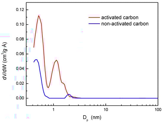 A higher amount of carbon dioxide was adsorbed by the activated material as for nitrogen adsorption. Previous studies [18] have related the amount of adsorbed carbon dioxide to the specific surface area corresponding to ultra-microporosity (pores with diameters lower than 0.7 nm). As indicated, this type of study complements that using nitrogen at 77 K, since this one, due to the low temperature used, has mass transfer limitations in low-size pores due to increased viscosity. This fact causes a nitrogen size exclusion, and it does not allow for determination of the pore volume corresponding to diameters lower than 0.7 nm. Therefore, based on the results shown in Figure 5, the activated carbon also seems to have a higher surface area than the non-activated carbon in the ultra-micropore range.