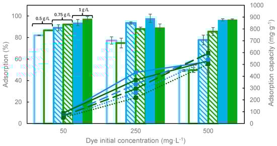 Influence of dye initial concentration on adsorption percentage (columns) and capacity (symbols + lines) of MB (blue) and MG (green). T = 25 °C, t = 24 h. Solid line: 0.5 g·L−1; dashed line: 0.75 g·L−1; dotted line: 1 g·L−1.