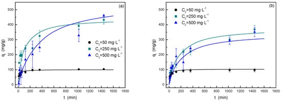 Adsorption kinetics for the adsorption of MB (a) and MG (b) adsorption by almond shell activated carbon using different initial dye concentrations at 25 °C, natural pH, and an adsorbent dosage of 0.5 g·L−1. Solid line corresponds to the fitting to the pseudo-second-order model.
