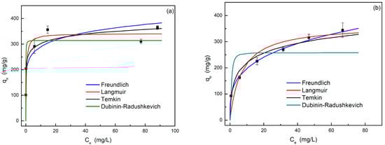 The equilibrium data were obtained for both dyes from the adsorption experiments carried out at an adsorbent dosage of 0.5 g·L−1, natural pH, and 25 °C for 24 h. The specific amount of adsorbent previously defined was added to solutions with several initial dye concentrations in Erlenmeyer flasks. These flasks were stirred at 210 rpm and 25 °C in a shaking water bath (H20 SOW-Lauda, Burgwedel, Germany). The Langmuir (Equation (6)), Freundlich (Equation (7)), Temkin (Equation (8)), and Dubinin–Radushkevich (Equation (9)) models were used to fit equilibrium the experimental data.