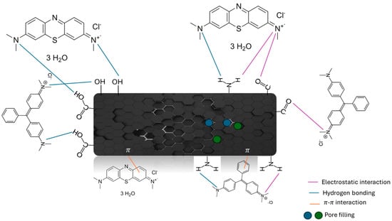 Based on the previously discussed experimental data, Figure 11 shows a proposal of the adsorption mechanism of MB and MG over this type of biomass-based carbon. FTIR spectra previously analyzed in Figure 3 agree with the proposed mechanism enhancing the interactions between nitrogen present in carbon and dyes with different functional groups: decreasing the band at 3400 cm−1 (N-H) and enhancing the band at 1402 cm−1 (N-O).