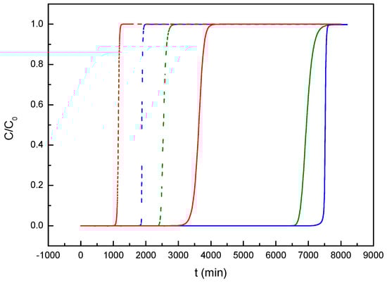 Simulated breakthrough curves for dyes adsorption by activated carbon: Red curves, MB adsorption in coconut shell carbon [34]. Blue curves, MB adsorption in almond shell carbon. Green curves, MG adsorption in almond shell carbon. Continuous lines: 50 mg·L−1, initial dye concentration. Dashed line: 200 mg·L−1, initial dye concentration. Flowrate, QL = 0.01 mL·min−1. Mass of carbon, mb = 12.1 g.