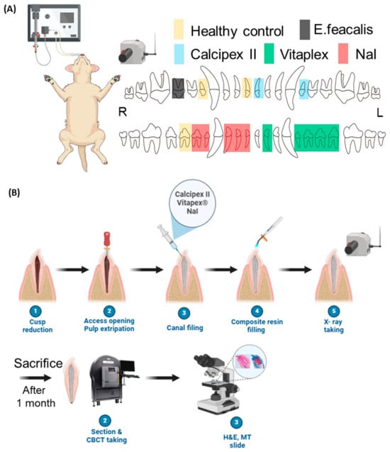 In this study, calcium hydroxide (Sigma-Aldrich, Burlington, MA, USA), sodium iodide (AlfaAesar, Heysham, UK), low-density silicone oil (Shin-Etsu Silicone KF-96 350 cst, Shin-Etsu Chemical Co., Tokyo, Japan), and lanolin (Deajung, Gyeonggi-do, Republic of Korea) for solubility adjustment were employed. The injectable pastes were prepared by blending the components on a glass surface using a spatula under sterile conditions. The composition of all experimental groups was 28.75:28.75:40:2.5 wt% for calcium hydroxide, odium iodide, low-density silicone oil, and lanolin, meeting ISO physicochemical standards [17,19]. As commercially available control materials, Calcipex II (Techno-Dent, Bangkok, Thailand) and Vitapex® (Neo Dental, Tokyo, Japan) were chosen. Following root canal treatment (pulpectomy), root-end filling material was randomly applied. Cavities were restored with IRM® (Dentsply Sirona, York, PA, USA) and sealed with 3M™ Filtek™ Supreme Flowable Restorative (3M EPSE, Seefeld, Germany) according to the manufacturer’s instructions. As a positive control to reveal the inflammatory response, 100 µL of 108 CFU/mL Enterococcus faecalis (E. faecalis, ATCC 19433, Manassas, VA, USA) was injected without root filling materials.