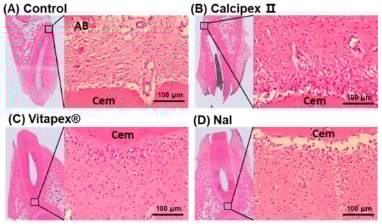 Representative high-magnification histological images (H&E) focusing on the periapical region of mongrel dog teeth after pulpectomy with different root canal filling materials. (A) Control group, showing normal periapical periodontal ligament (PDL) tissue composed of fibrocollagenous tissue and a few blood vessels, indicating healthy periapical conditions with no evidence of inflammatory infiltration or other pathological changes. (B–D) Teeth filled with Calcipex, Vitapex, and NaI after pulpectomy, respectively, showing periapical regions with fibrocollagenous tissue and small blood vessels, with no significant pathological differences compared to the control group (A). NaI groups showed similar a normal periapical tissue structure. Cem, cementum; AB, alveolar bone; H&E, hematoxylin and eosin staining. The E. faecalis group showed inflammatory signs as a positive control (see Supplementary Figure S2).