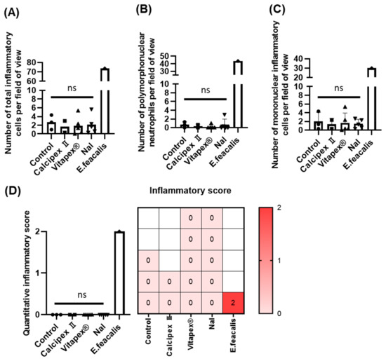 Quantitative evaluation of periapical inflammation after applying root canal filling materials based on H&E-stained images. (A) Total number of inflammatory cells in the periapical area. (B) Number of neutrophils. (C) Number of mononuclear inflammatory cells. (D) Quantitative inflammatory scoring based on histology images (0, mild inflammation; 1, moderate inflammation; 2, severe inflammation). There was no significant difference in the number of inflammatory cells between the control group and all filling material groups, including NaI. However, when compared with the E. faecalis group, there were significant differences in all experimental groups, including the control group. Non-parametric Kruskal–Wallis test with Dunn’s multiple comparison test was performed. No significant (NS) is based on p value at 0.05. Different shapes from bar graph mean different groups.