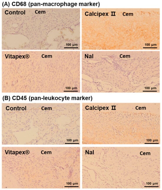 To objectively and accurately detect inflammatory cells, immunohistochemistry for CD68 and CD45 was referenced. CD68 is a marker specific to macrophages, while CD45 is a cell surface marker expressed on inflammatory cells such as lymphocytes, eosinophils, basophils, macrophages, mast cells, and plasma cells. In evaluating inflammatory cells using CD45 and CD68, both the morphology of cells observed in H&E staining and the cytoplasmic positivity by each antibody were considered. Interestingly, CD45-positive and CD68-positive cells are observed at the outermost part of the cementum, between the cementum and the periodontal ligament (PDL) (CD45 and CD68 for Calcipex II group in Figure 6), which are thought to be cementoblasts rather than inflammatory cells.