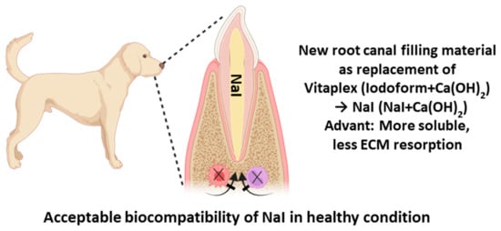 Schematic image of NaI biocompatibility as a root canal filling material in a canine study. Compared to the commercially available calcium hydroxide-based material (Calcipex II) and the calcium hydroxide and iodoform mixture (Vitapex®), the newly developed NaI (calcium hydroxide and soluble sodium iodide) showed great biocompatibility as a root canal filling material in healthy teeth after pulpectomy. New root canal filling material (NaI) was developed as a replacement for Vitapex® to overcome the insoluble property of iodoform introduced by sodium iodine (NaI).