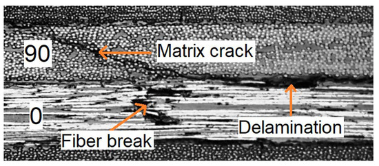 Micrograph of a cross-section of composite laminate showing different failure modes.