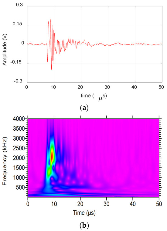 Delamination event obtained during the experiment: (a) Waveform. (b) Wavelet transform.