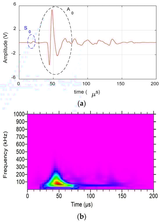 Figure 4 shows the AE waveform received from matrix crack events and its wavelet. The presence of S0 and A0 lamb wave modes can be clearly seen from the waveform and the wavelet. The S0 mode exhibits a low frequency arriving first, followed by a high frequency, whereas the A0 mode shows a high frequency arriving first, followed by a low frequency. This behavior is due to the differing group velocities of frequencies, as illustrated in the dispersion curve in Section 3. The waveform is also observed to have moderate amplitude and duration (<60 µs) with frequency extending up to 650 kHz. Similarly, Figure 5 shows the AE waveform received from a delamination event along with its wavelet. The dominant presence of A0 can be seen in both waveform and wavelet, with S0 mode buried in noise. The signal also has a high amplitude and very low-frequency content of <250 kHz, as seen in the figure.