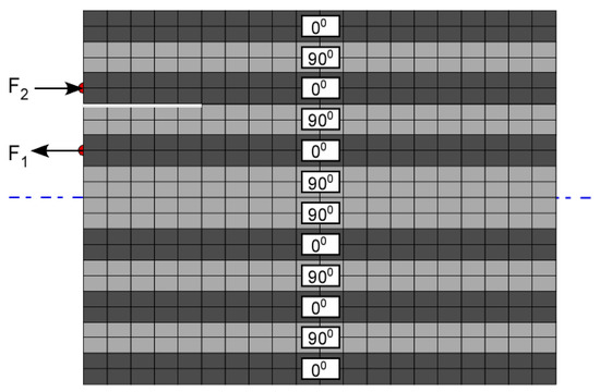 Figure 7 shows the schematic of various locations of impulses applied to model fiber break and matrix crack events. Different locations were used in individual models to study the variation in modal components of the waveforms received for the failure modes considered. With most delaminations developed from matrix cracks under the influence of in-plane shear force at the matrix crack tip, delamination was modeled as a Mode II fracture dominated by A0 Lamb waves [12]. Hence, a couple system, as seen in Figure 8, was used to simulate delamination in FEM models.