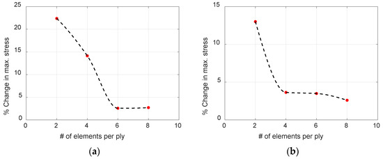 Mesh convergence analysis ensures that results from FEA are not affected by changing mesh size and, hence, is essential to establish mesh independence. H-refinement, where the element size is reduced, and p-refinement, where the element order is increased, are the two methods generally used for mesh convergence analysis [28]. In this study, h-refinement analysis is performed on a 2D composite bar under impulse loading, as detailed in Section 3, to ensure accurate propagation of applied impulse energy. The number of elements in each ply in the thickness direction was successively increased until the coefficient of variation in displacement and stresses was below 5%.