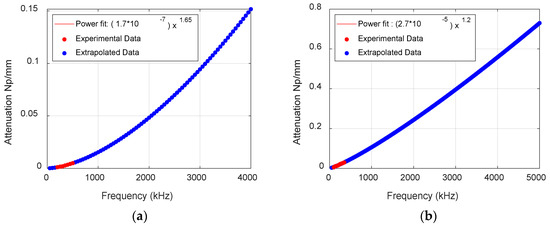 Experimental and extrapolated attenuation values along 00 for (a) symmetric and (b) anti-symmetric modes.