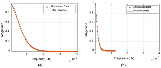 Frequency-dependent attenuation was incorporated in the post-processing of FEM waveforms by designing and applying an arbitrary magnitude response filter to match the attenuation values, as seen in Figure 10. The attenuation measurement was taken by exciting the fundamental Lamb wave modes in the cross-ply laminate of layup [0/90]3s using burst signals of frequencies ranging from 100 kHz to 500 kHz and measuring the signals at various distances and angles [15]. The attenuation values measured from the experiments for these frequencies were then extrapolated to obtain the values for higher frequencies. While the higher-order modes are challenging to excite and highly attenuated compared to fundamental modes, the same attenuation was applied for all symmetric and anti-symmetric modes. The attenuation values and response of the filter for the waveform received at 100 mm from the source are seen in Figure 11.