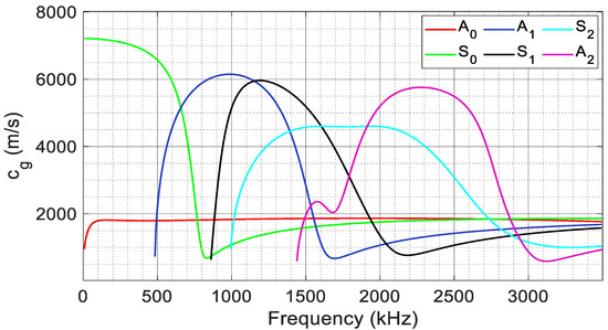 Figure 12 displays the dispersion curves for the group velocities of various Lamb wave modes in the thermoset composite examined in this study. These curves illustrate the wave propagation velocities of different mode shapes within the materials and serve as a tool to validate the results obtained from the finite element analysis.