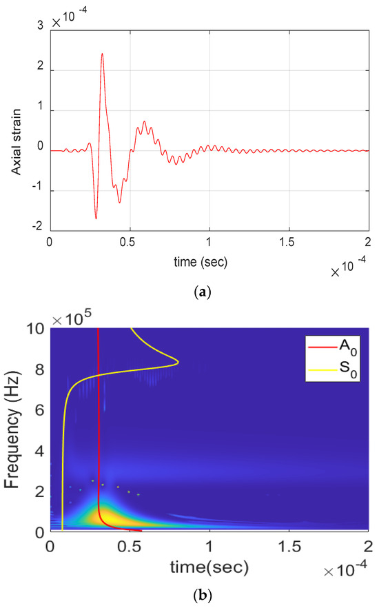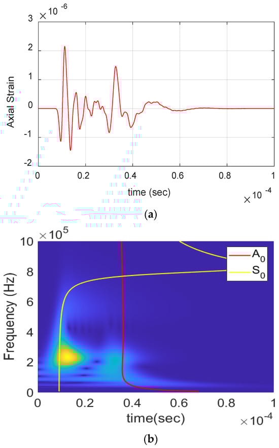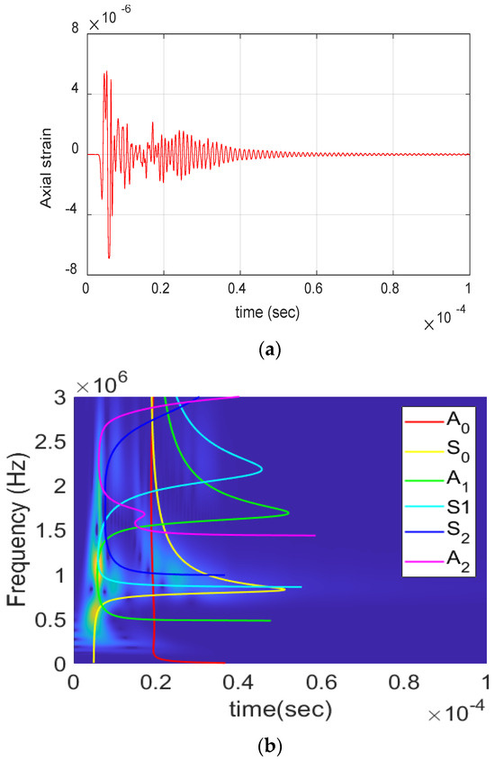 Simulated MC event obtained at 50 mm from the source at impulse location MC2: (a) Axial strain. (b) Wavelet fitted with dispersion curve.
