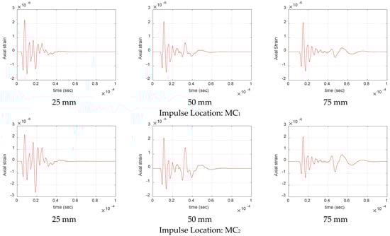 Figure 16 shows the respective change in amplitude of S0 and A0 mode of matrix crack with distance for source located at MC1 and MC2. As seen from the figure, the amplitude of S0 mode, given by the leading edge of the signal, is similar for both offset positions. In contrast, a significant difference in the amplitude of A0 mode, given by the trailing edge of the signal, can be seen. The amplitude of the A0 mode is seen to increase as the distance of the source from the neutral axis increases, as seen from the waveform at 25 mm for MC1 and MC2. This rise in amplitude is primarily attributed to the increased bending moment, which generates anti-symmetric modes as the distance of the source from the neutral axis increases. Similarly, a substantial drop in amplitude of A0 mode compared to S0 can also be seen as anti-symmetric modes are highly attenuated compared to symmetric modes, as seen from the attenuation plots in Figure 10. This significant difference in attenuation is mainly due to the nature of excitation of symmetric and anti-symmetric modes. The anti-symmetric modes generate greater out-of-plane displacements at the material’s surface, increasing the possibility of energy leakage into the surrounding media. Similarly, these modes typically have higher strain energy because of their out-of-plane motion, leading to more attenuation, as energy dissipation is proportional to the strain amplitude. In contrast, the symmetric modes have in-plane motion, where particle displacements are largely along the direction of propagation and have less surface interaction. Additionally, the in-plane motion produces a more uniform displacement field, leading to lower strain gradients compared to anti-symmetric modes and hence resulting in lower attenuation [30].