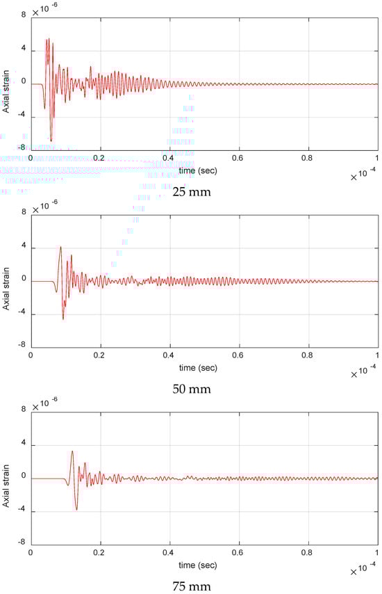 Similarly, Figure 17 shows the change in waveforms with distance for fiber break events for impulse located at FB2. The high-frequency content of the signal at 25 mm indicates the presence of a higher-order mode in fiber break signals. As the source-to-sensor distance increases, amplitude and frequency content in the signals decrease, making the position of AE sensors crucial to capture these signals appropriately. As the damage mechanisms in pristine specimens are randomly distributed along the entire gage length, a dense array of AE sensors, as seen in Figure 1, is essential in capturing these events effectively.