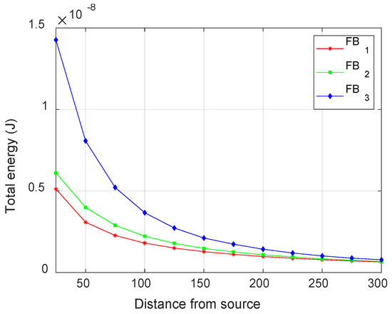 The energy content of the waveform, represented by the area under the rectified and squared signal, was also calculated to study the variation in energy with increasing source-to-sensor distance for fiber break and matrix crack failure modes. While delamination events mainly give low-frequency signals (<200 kHz) that are less attenuated, the presence of mid-frequency (250–650 kHz) and high-frequency (>700 kHz) components in matrix crack and fiber break, respectively, make them highly susceptible to attenuation. Figure 18 shows the variation in signal energy for increasing source-to-sensor distance for the fiber break models considered. An exponential decrease in energy is evident across all three models, with the severity increasing as the events move further away from the neutral axis. This variation in energy is primarily attributed to the presence of anti-symmetric modes, which exhibit an increase in amplitude with an increase in distance from the neutral axis and are significantly more attenuated than symmetric modes.