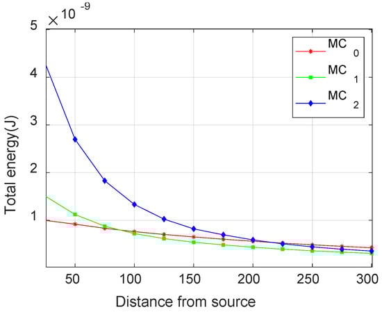 Similarly, Figure 19 shows the variation in energy of matrix crack events for increasing source-to-sensor distance at different locations. The matrix crack at the neutral axis (MC0) shows only symmetric modes, resulting in minimal energy variation due to the low attenuation of these modes. In contrast, a significant drop in energy is observed for the matrix crack event furthest from the neutral axis (MC2). This decrease is primarily due to the higher attenuation of anti-symmetric modes, as previously discussed.