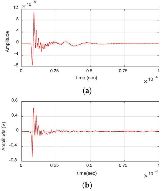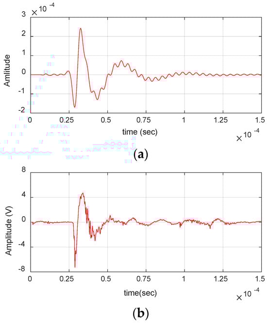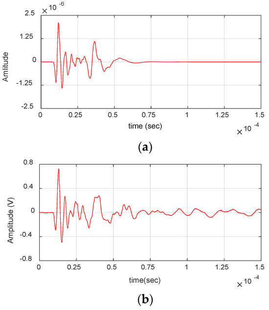 Comparison of waveforms from FEM and experiments for matrix crack: (a) FEM. (b) Experimental waveform (C.C 84%).