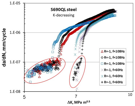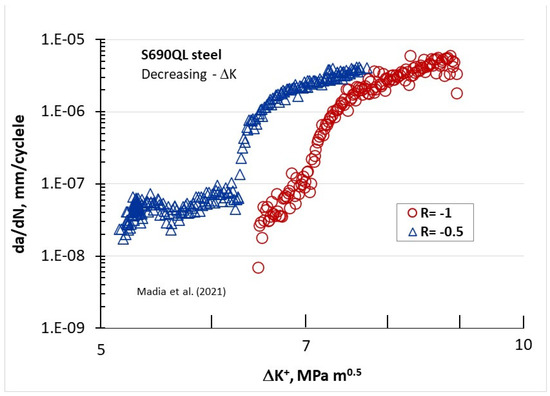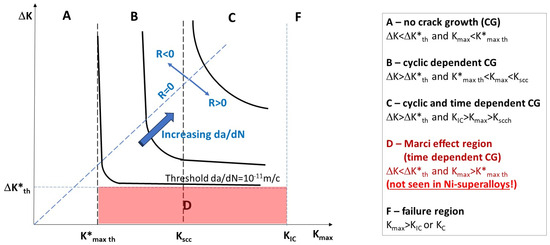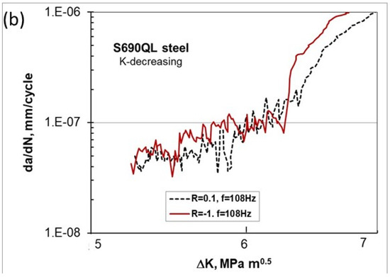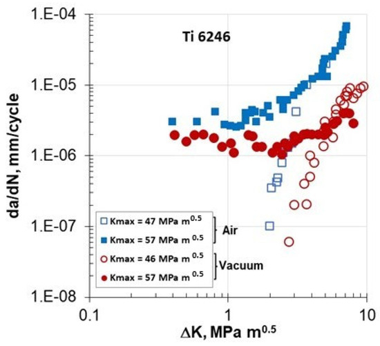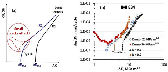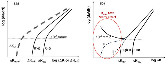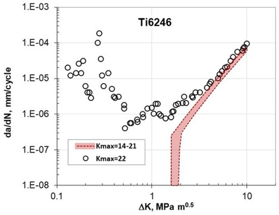 - Marci, G. Abnormal da/dN—ΔK curves: New failure mode with Ti-alloys. Mater. Werkst. 1997, 28, 51–58. [Google Scholar] [CrossRef]