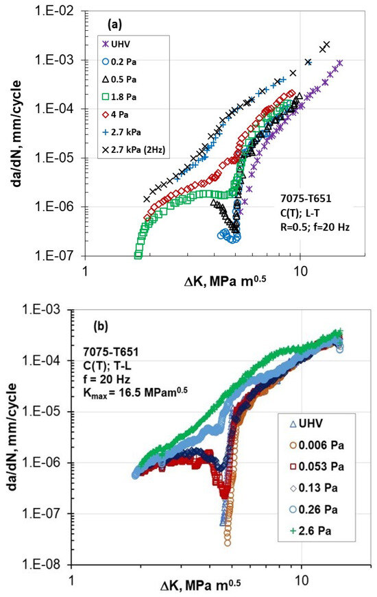 - Vasudevan, A.K.; Kujawski, D. Implications of ΔK-R ratio in vacuum. In Fatigue & Fracture of Engineering Materials & Structures; John Wiley & Sons: Hoboken, NJ, USA, 2022; pp. 1–12. [Google Scholar]