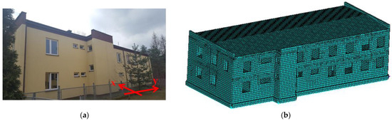 A numerical analysis concerning the effect of load-bearing wall material on structure dynamic properties is based on a selected construction of the actual building structure. The view of this actual building is presented in Figure 2a. Additionally, in Figure 2a, the horizontal transverse (x) and longitudinal (y) axes of the building are marked in red.