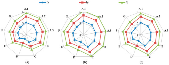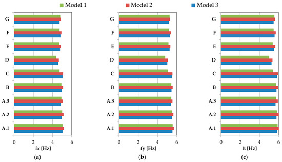 Comparison of natural vibration frequencies determined using Model 1, Model 2, and Model 3 in the case of the analyzed variants of building walls: (a) fx; (b) fy; (c) ft.