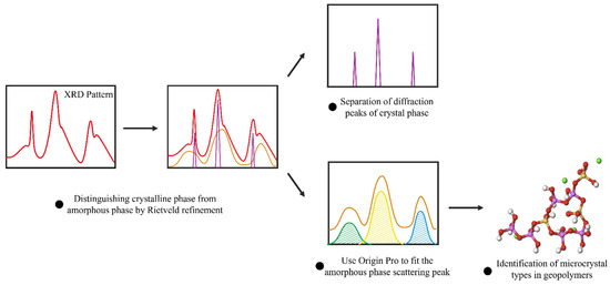 The method of crystal phase determination through refinement is illustrated in Figure 1. Highscore 5.2 was utilized to identify the crystal phase composition, while GSAS-II [31] software was employed for Rietveld refinement of the XRD pattern. To ensure the accuracy of the refinement, the fitting value (Rwp) needed to be reduced to approximately 10% for it to be deemed effective. If the Rwp cannot be decreased after several cycles of operation, the crystal phase is re-refined. Once the complete crystal phase information is obtained, it is isolated, and only the background part of the refinement fitting is retained. This section consists of window scattering and scattering peaks of amorphous materials. The window scattering interference is eliminated by leveling the baseline to isolate the scattering peaks of amorphous components. Peak fitting was conducted using Origin Pro, 9.0. The diffraction peak positions from standard card data of natural minerals were used as the peak center sites. The Voigt peak function was applied for fitting, and the result with the highest fitting value was chosen as the final outcome.