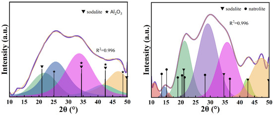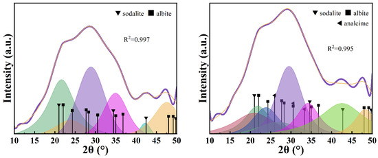 After fitting the scattering peaks of the amorphous phase of GEO-3 (Figure 3, left), it was found that the amorphous phase of GEO-3 had the best matching effect with the characteristic peaks of sodalite and albite, and the fitting value reached 0.997. The chemical formula of albite is Na(AlSi3O8), and its amorphous hydrogel composition can be written as Na2[(Si-O2)3-Al-O2]2·wH2O, which satisfies the general molecular formula of the N-A-S-H structure. The amorphous phase of GEO-3 is composed of sodalite and albite, so the actual n(Si)/n(Al) ratio should be between 1 and 3. After fitting the scattering peaks of the amorphous phase of GEO-4 (Figure 3, right), it was found that the amorphous phase of GEO-4 had the best matching effect with the characteristic peaks of sodalite, analcime, and albite, and the fitting value reached 0.995. The chemical formula of analcime is NaAlSi2O6·H2O, and its amorphous gel composition can be written as Na1[(Si-O2)2-Al-O2]1·1H2O, which satisfies the general molecular formula of the N-A-S-H structure. The amorphous phase of GEO-4 is composed of sodalite, analcime, and albite, so the actual n(Si)/n(Al) ratio should be between 1 and 3.