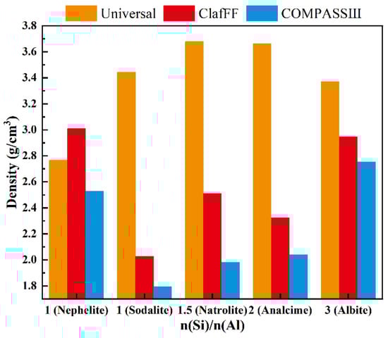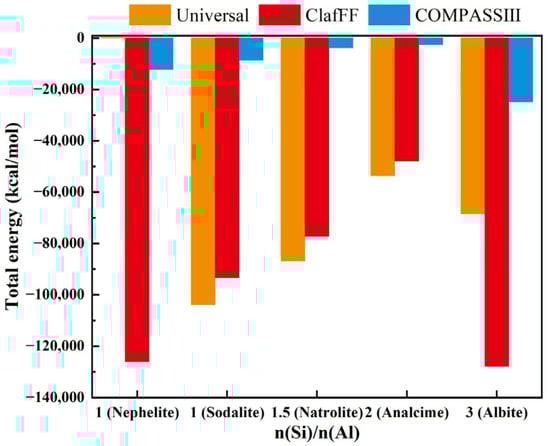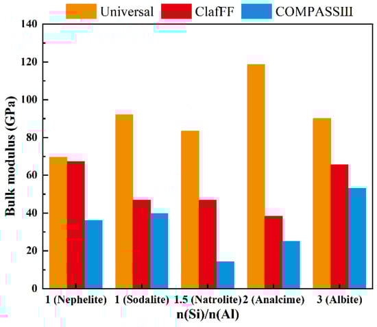 The density (Figure 8), energy (Figure 9), and bulk modulus (Figure 10) of the model are calculated under three different force fields, and the calculation results show significant differences. The material density calculated by the Universal force field is high, which differs greatly from the actual scenario. The calculation results of the other two force fields closely follow the calculation trend, both showing ‘W’ type broken lines. The nephelite model has a higher density due to its closer stacking. The other four models have the same stacking mode (ABC stacking). Under the two force fields, the overall density increases with the increase of n(Si)/n(Al). An exception is that the analcime model has a lower density than the natrolite model under the ClayFF force field. The energy calculation results effectively demonstrate the applicability of the three different force fields. The energy calculation results of various models under the COMPASS III force field are stable and consistently maintained at the same order of magnitude. The absolute energy value of the analcime model is the lowest, while the albite model has the highest absolute energy value. Although the calculated results of the ClayFF force field fluctuate significantly, the overall trend aligns with the results of COMPASS III. The nephelite model energy calculated by Universal is positive, but the absolute energy value of the N-A-S-H model of the ABC-6 family type also shows a trend of initially increasing and then decreasing with the increase of n(Si)/n(Al), with the lowest point being the analcime model. The other four models have the same stacking mode (ABC stacking). Under the two force fields, the overall density increases with the increase of n(Si)/n(Al). An exception is that the analcime model has a lower density than the natrolite model under the ClayFF force field.
