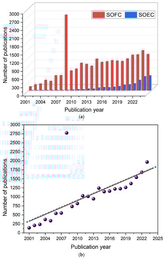 (a) Comparing the number of publications related to SOFCs and SOECs from 2001 to 2023 [13]. The red color represents SOFCs publications, while the blue color represents SOECs publications. (b) The cumulative SOFC and SOEC number of publications over time, from 2001 to 2023. The publications are represented by a purple color and the trend is visualized using a linear regression line.